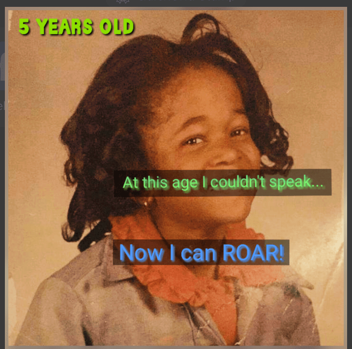 I was 5 years old in this picture and being sexually abused by someone I loved and trusted that should have been protecting me. I couldn’t speak then but I can ROAR now!!! Join me and my organization R.O.S.A Rising Over Sexual Abuse, Three Sexual Assualt Awareness Month Walks in April three different states South Carolina, New Jersey and Connecticut Breaking the silence against sexual abuse one state at a time.
