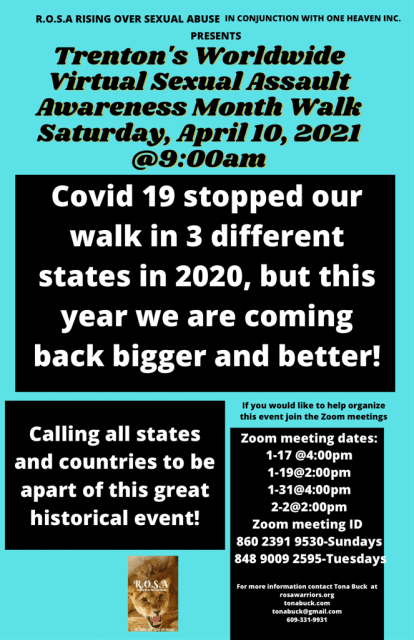 January 6, 2021January 16, 2021tonabuckLeave a Comment on Trenton’s Worldwide Sexual Assault Awareness Month Walk Saturday, April 10, 2021 Trenton’s Worldwide Sexual Assault Awareness Month Walk Saturday, April 10, 2021 Share this: Click to share on X (Opens in new window) X Click to share on Facebook (Opens in new window) Facebook Like Loading... Related
