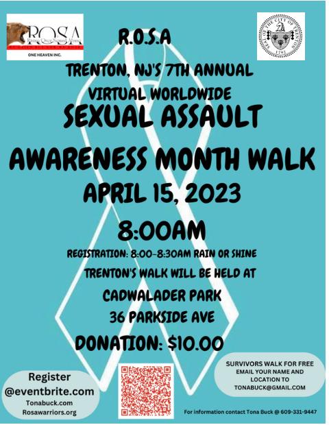 TRENTON NJ’S VIRTUAL WORLDWIDE SEXUAL ASSAULT AWARENESS MONTH WALK REGISTER NOW! https://www.eventbrite.com/e/rosa-trenton-nj-virtual-worldwide-sexual-assault-awareness-month-walk-tickets-525853932267 Share this: Click to share on X (Opens in new window) X Click to share on Facebook (Opens in new window) Facebook Like Loading...